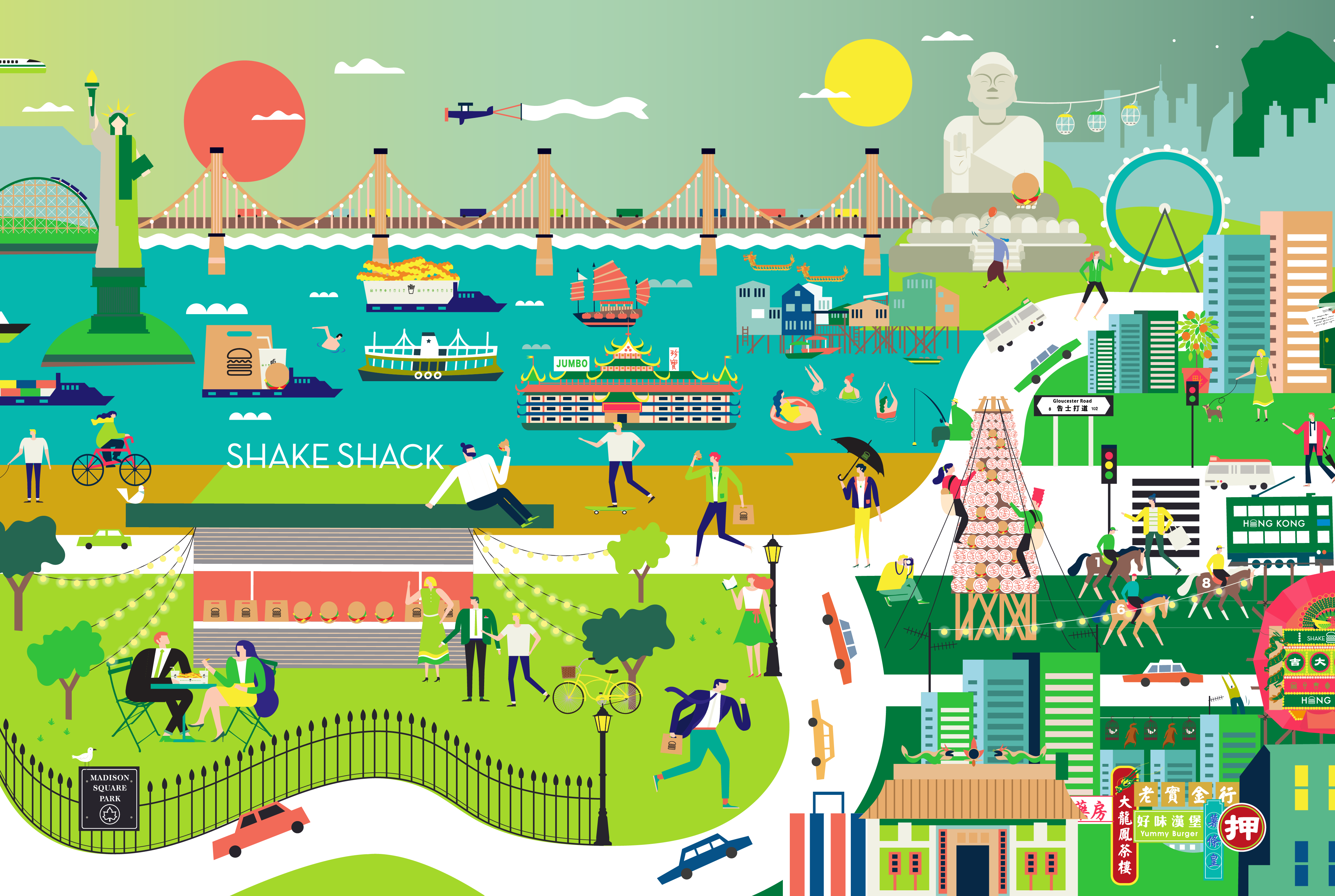 Creating the Shake Shack Community with the theme of “Happy 2 Gather” as it is for promoting the new opening shop of Shake Shack in Pacific Place, the second shop in Hong Kong. People are all enjoying their life, sharing their happiness. Busy and lively community with different activities happening in this Shake Shack World. Through this illustration, try to create a bold, vibrant and fresh atmosphere and match with the core concept of Shake Shack.